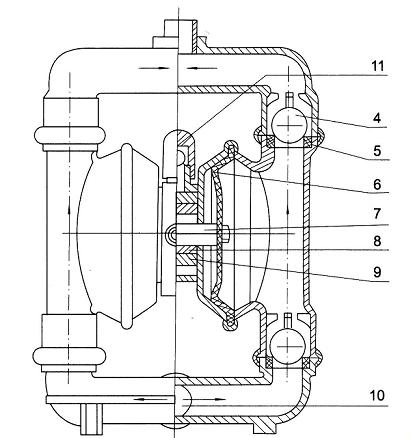 1 進氣口 2 配氣閥體 3 配氣閥 4 圓球 5 球座 6 隔膜 7 連桿 8 連桿銅套 9 中間支架 10 泵進口 11 排氣口