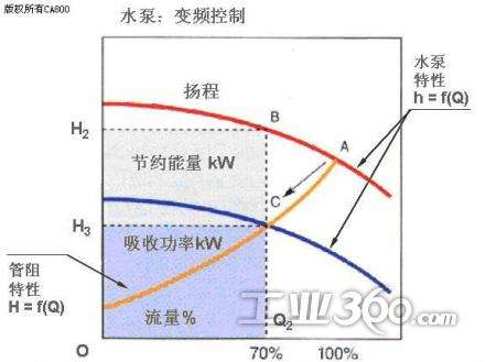 ②由于某些大型循環水泵的規劃參數而被適應于某些循環水泵系統,即所謂的“大馬拉小車”,它在這種情況下具有一定的作用,依賴于泵的頻率來改變泵馬達的頻率降低泵的轉速,調整泵的Q和H值,并使泵的實際流量值低于泵的額外流量值,以達到節能的目的。