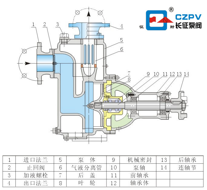 在啟動自吸泵之前,必須先向儲水箱注水。自吸泵啟動后,葉輪進口處的液體被拋入蝸殼并進入儲液室,從而在葉輪組中形成真空。在壓力差的作用下,儲液室中的水通過打開的回流閥由回流孔噴出。葉輪流與來自流經管道的氣體充分混合,并由葉輪排到儲水箱中 。氣液混合物在密度差的作用下分離。氣體上升到存儲腔上方并排放到出口管中,液體下沉到存儲腔下方。通過返回孔循環回到葉輪的入口,以便在泵的管道中的氣體耗盡后,自吸泵進入正常工作狀態。自吸泵正常運行后,在壓力差的作用下,回流自動關閉(或手動關閉)。